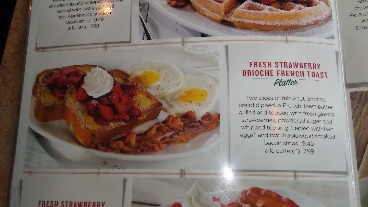 Three eggs*, three Applewood smoked bacon strips, three sausage links, two made-from-scratch buttermilk pancakes, two slices of French toast and crispy hash browns or breakfast potatoes.