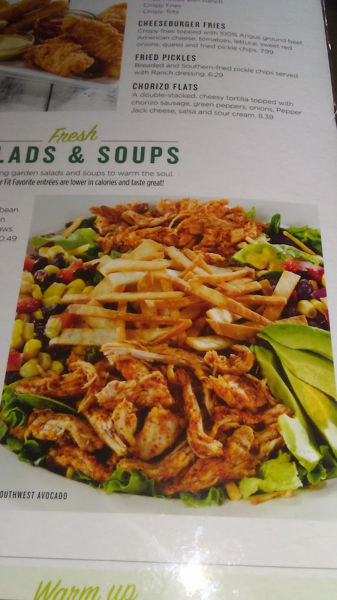 A fresh-Mex salad with blackened chicken, black bean corn relish, American cheese and fresh avocado on garden greens. Garnished with crunchy tortilla straws and served with a zesty Chipotle Ranch dressing.